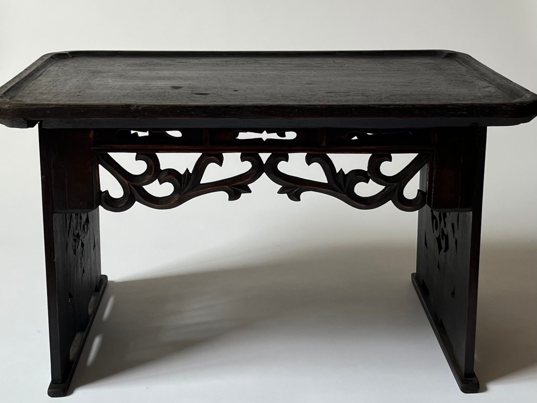 古い天板を使い、下の脚や飾り彫は現代の職人が制作した物。