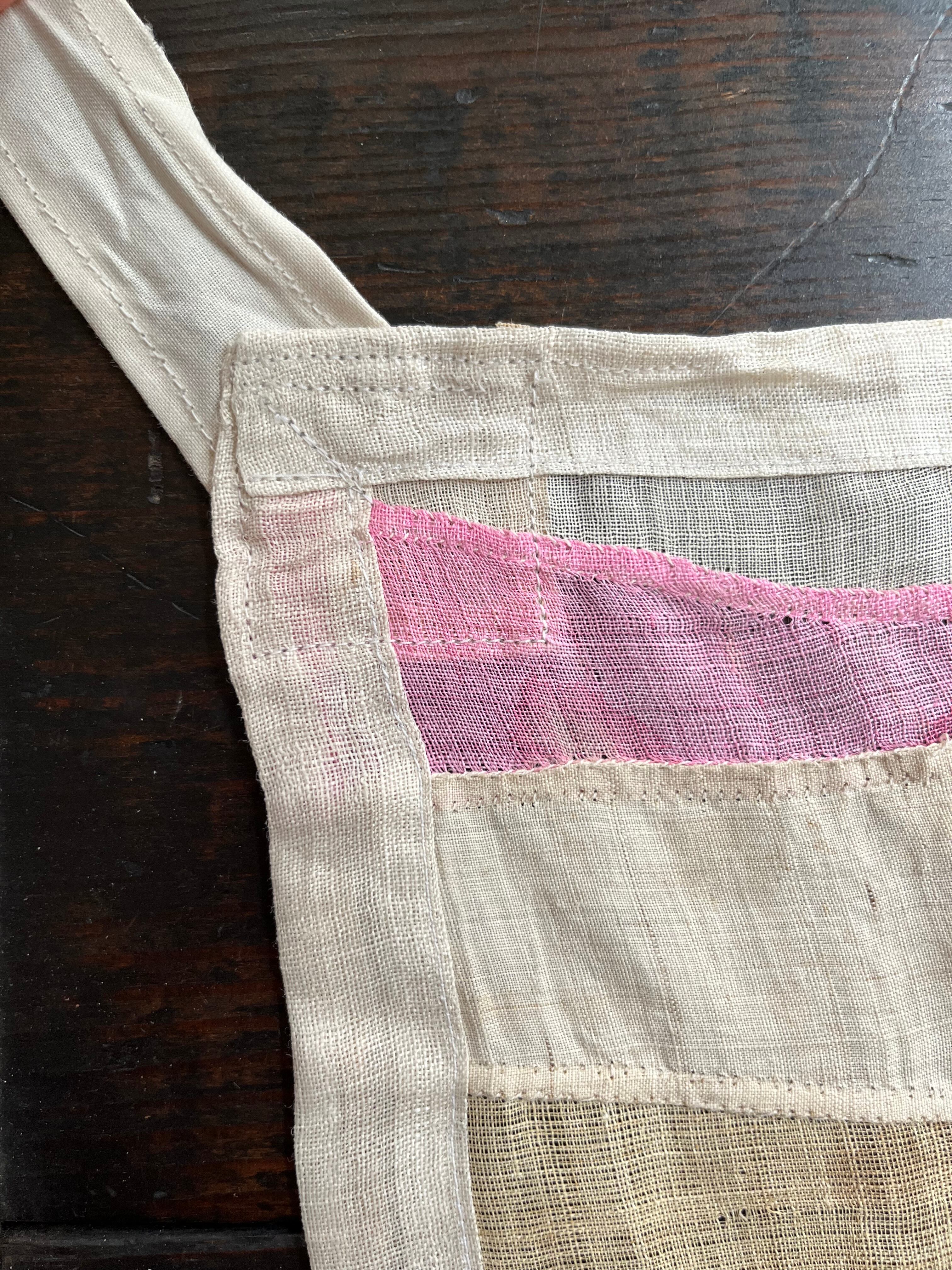 こちらのポジャギは四方の仕上げと、綿で作られた紐部分はミシンで、その他は手縫いで作られています