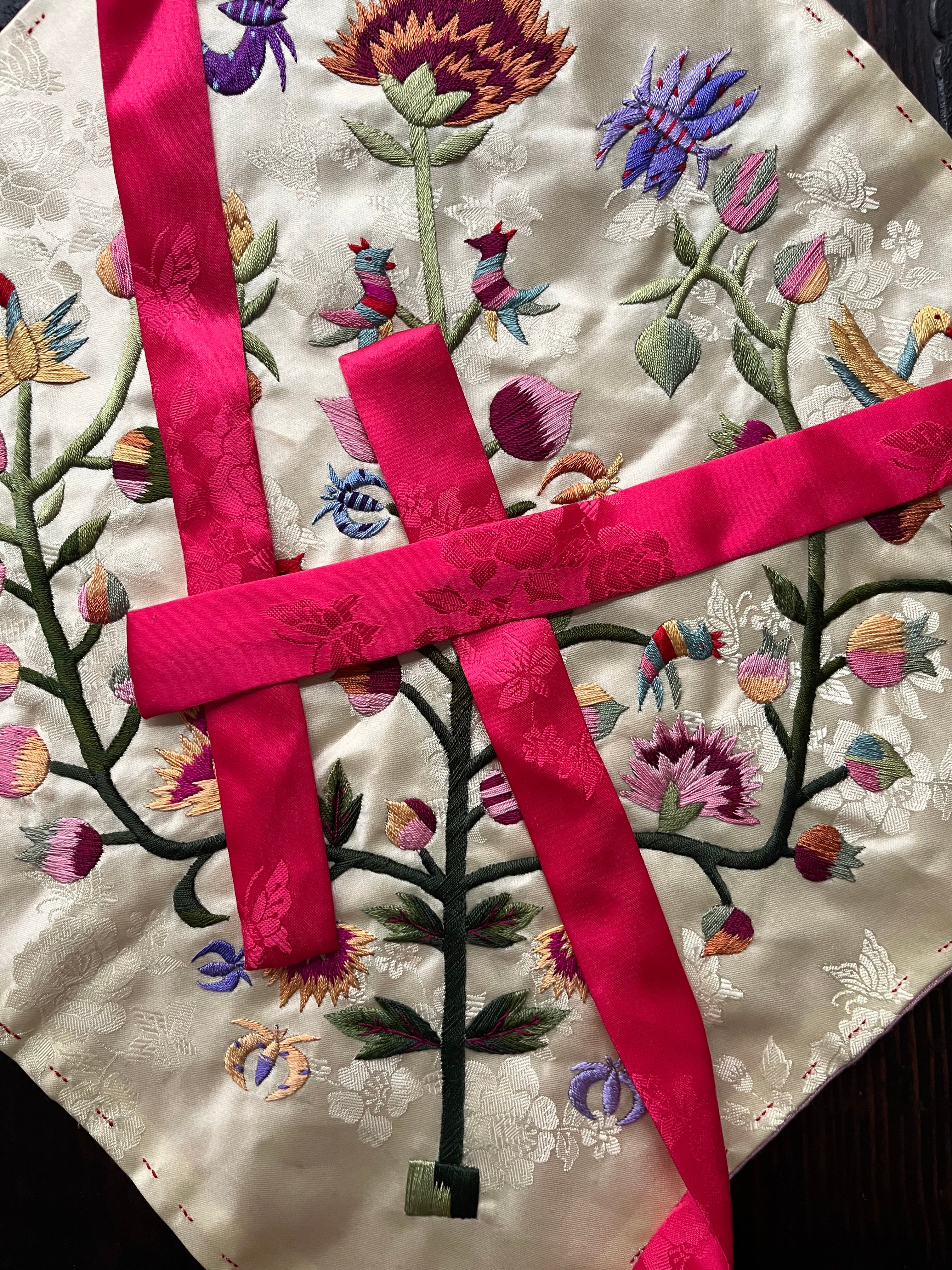 こちらはゴールドに近いベージュ色の絹生地に、植物や花の図案が散りばめられています。